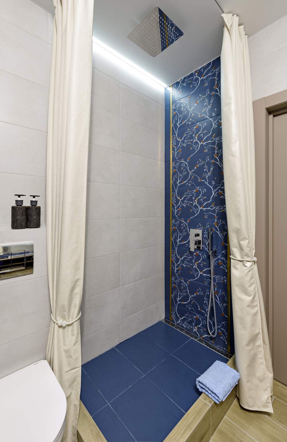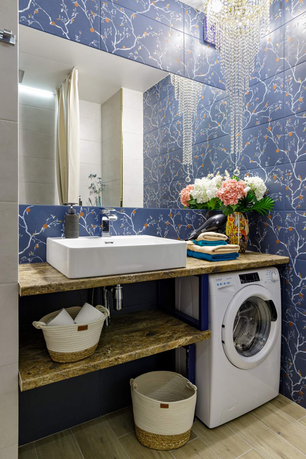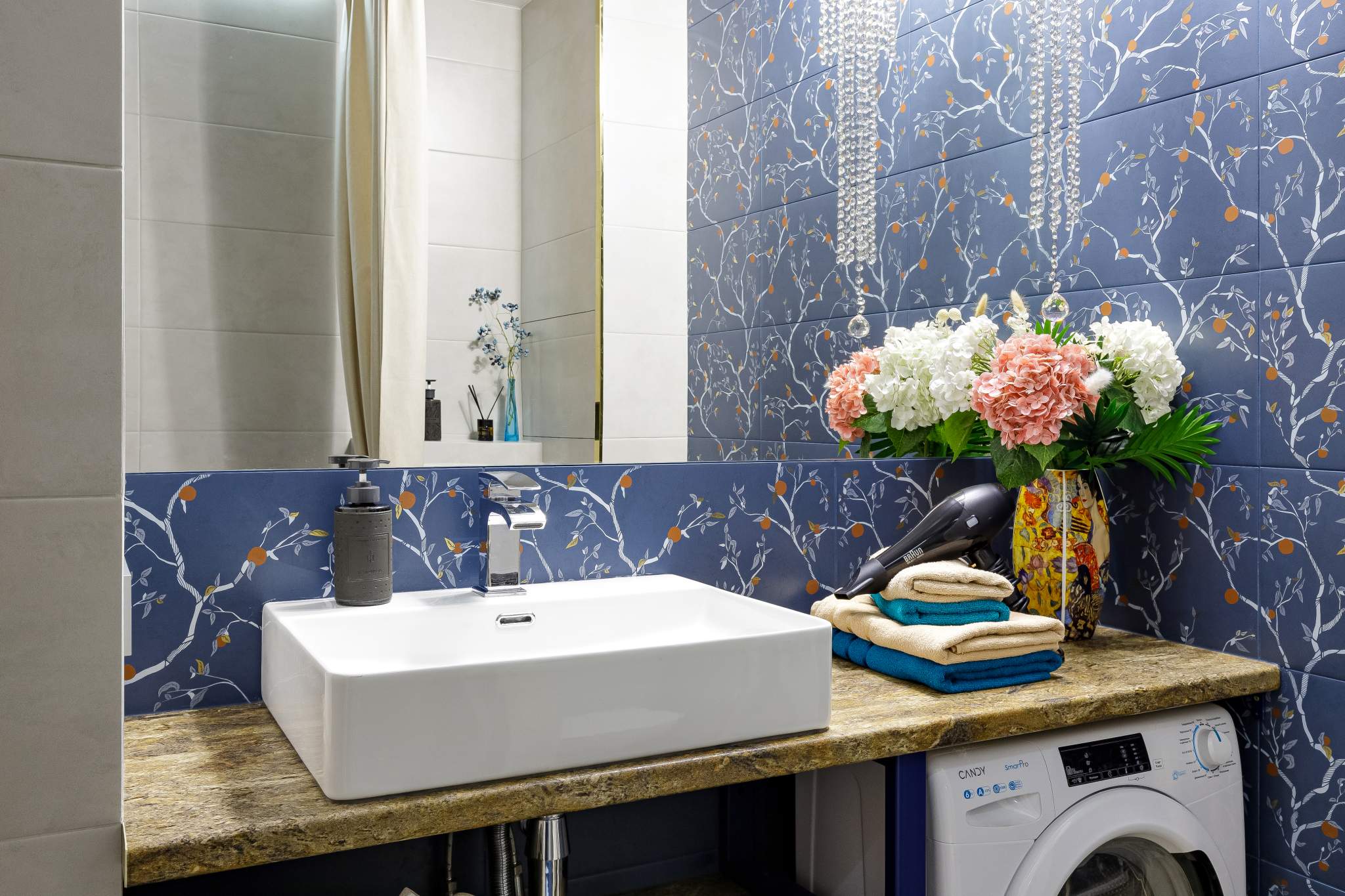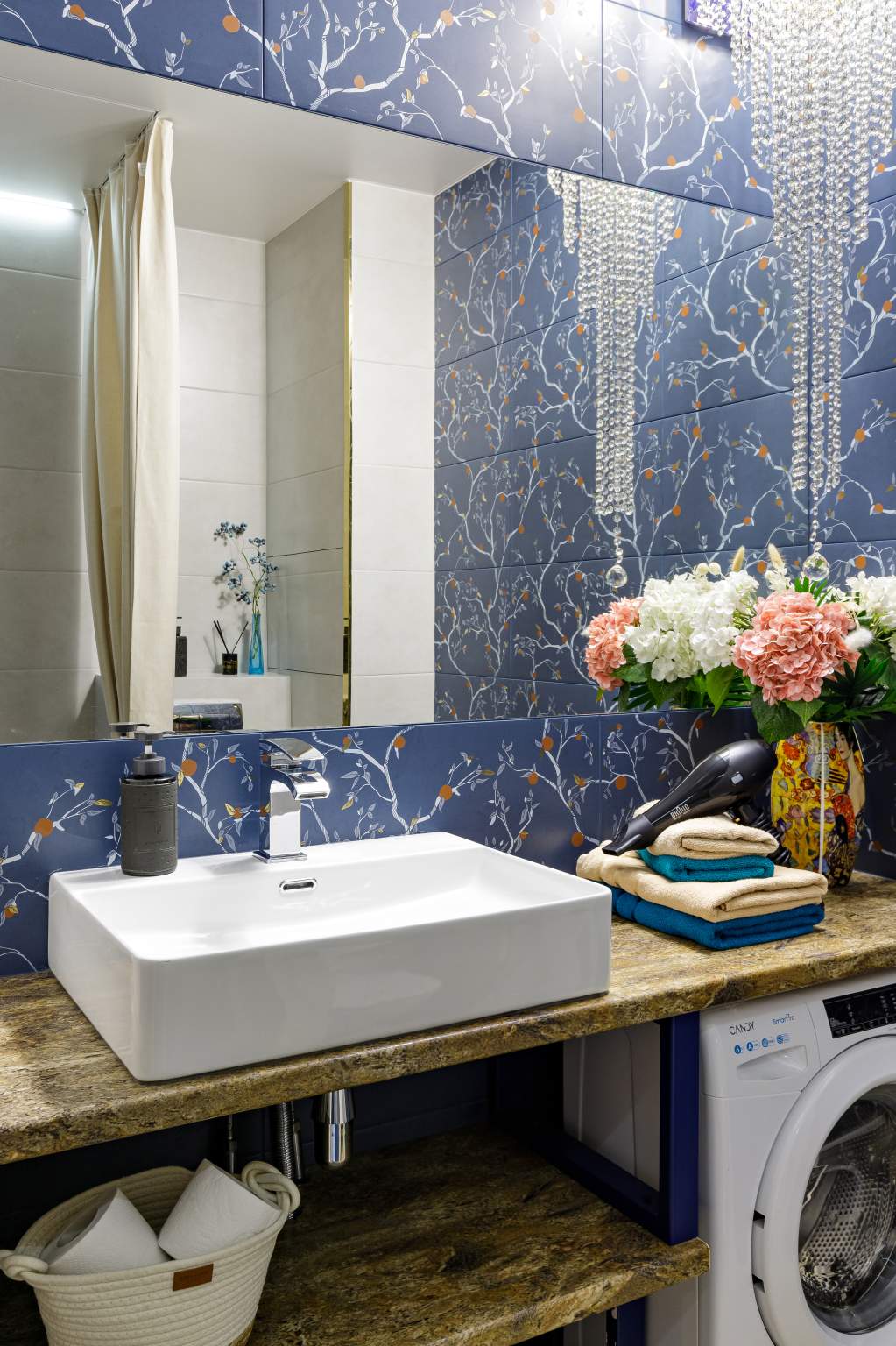 Ванная комната: с хрустальной люстрой, огромным зеркалом и качественной сантехникой. Установлена стиральная машина, продуманы полки для хранения, инсталляция и душ.