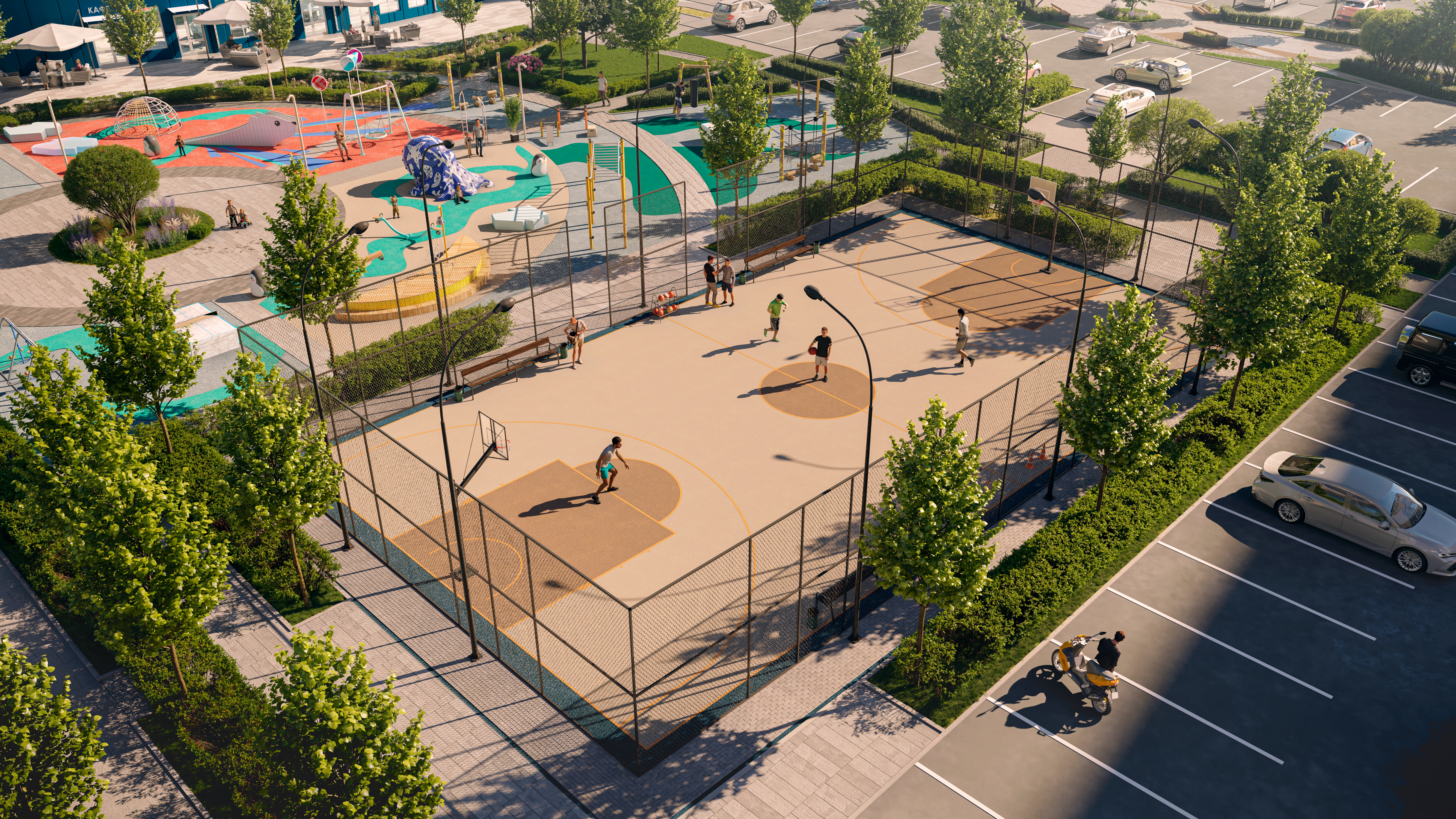Отдельная многоуровневая парковка, парковка охраняется. Обеспечение безопасности: видеонаблюдение, противопожарная система. Инфраструктура: детский сад, детские площадки, спортивные площадки, места для отдыха, супермаркет, рестораны, фитнес-центр, пункты бытового обслуживания, коммерческие объекты.