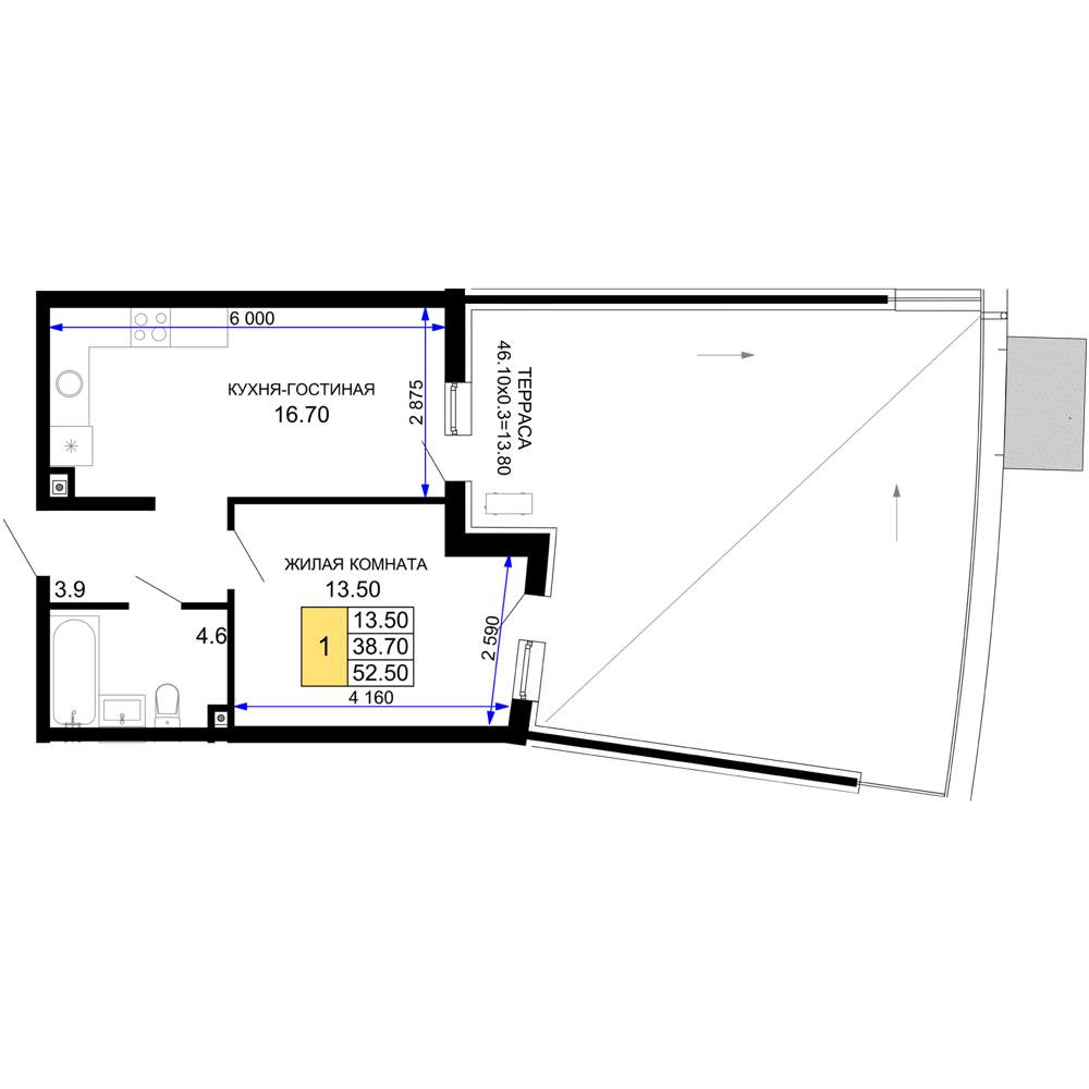 Жилая площадь 13.5 м2, кухня 16.7 м2, предчистовая отделка, комнаты изолированные.