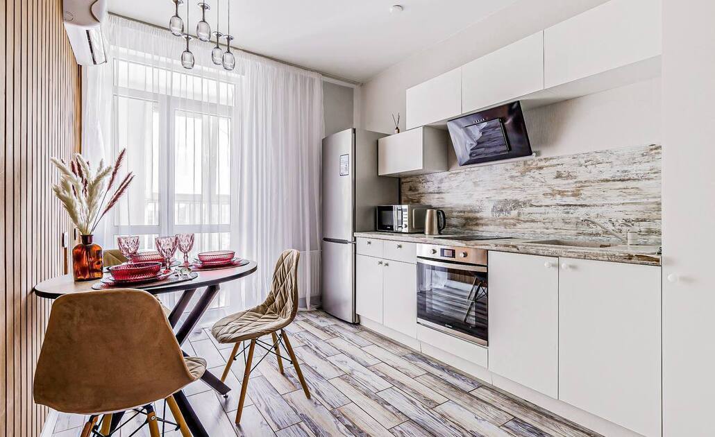 Укомплектованная техникой и посудой кухонная зона