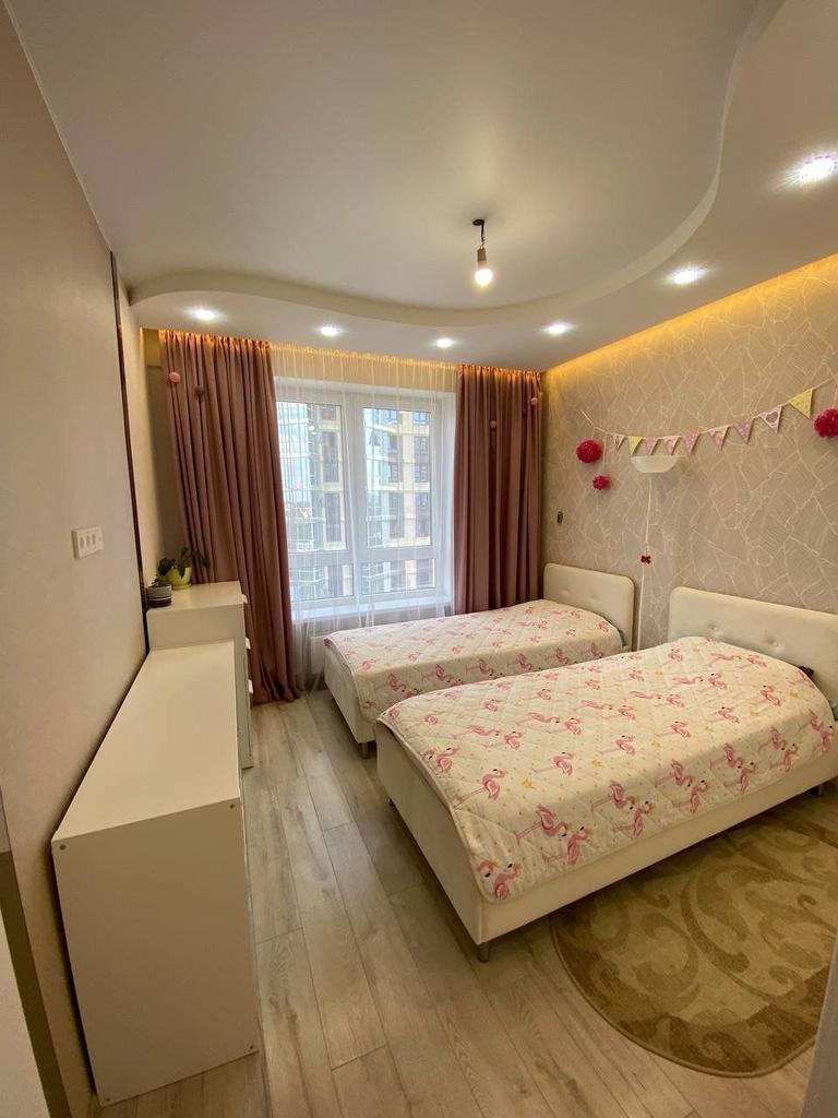 Две отдельные спальни и объединённая кухня с гостевой комнатой. Санузел раздельный,установлен бойлер на 80 литров,рабочая зона на кухне и лоджии керамо гранит(тёплый пол),большая прихожая, окна выходят на две стороны дома
